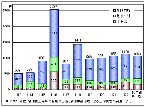 平成22年には全国45都道府県で1,128件(土石流234件、